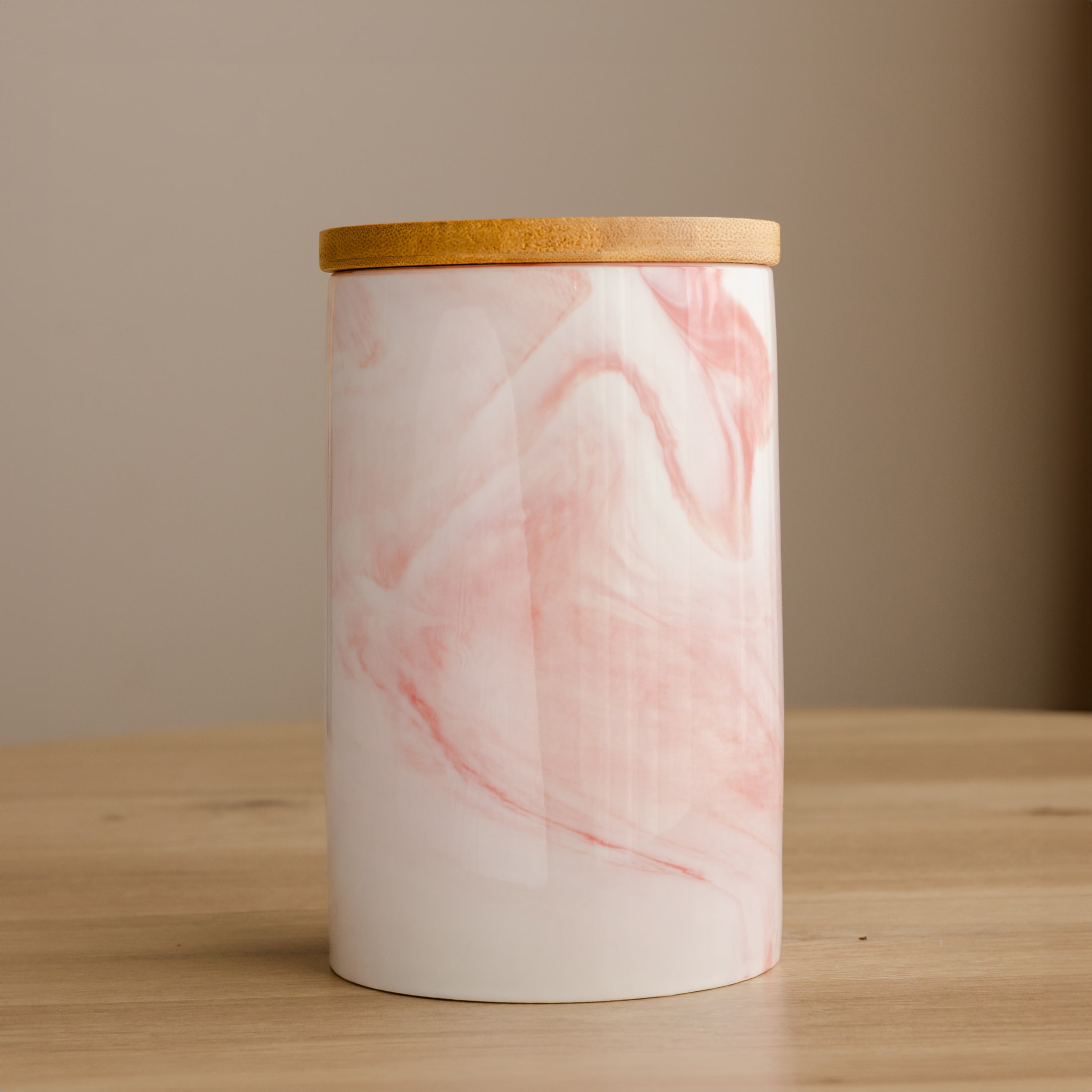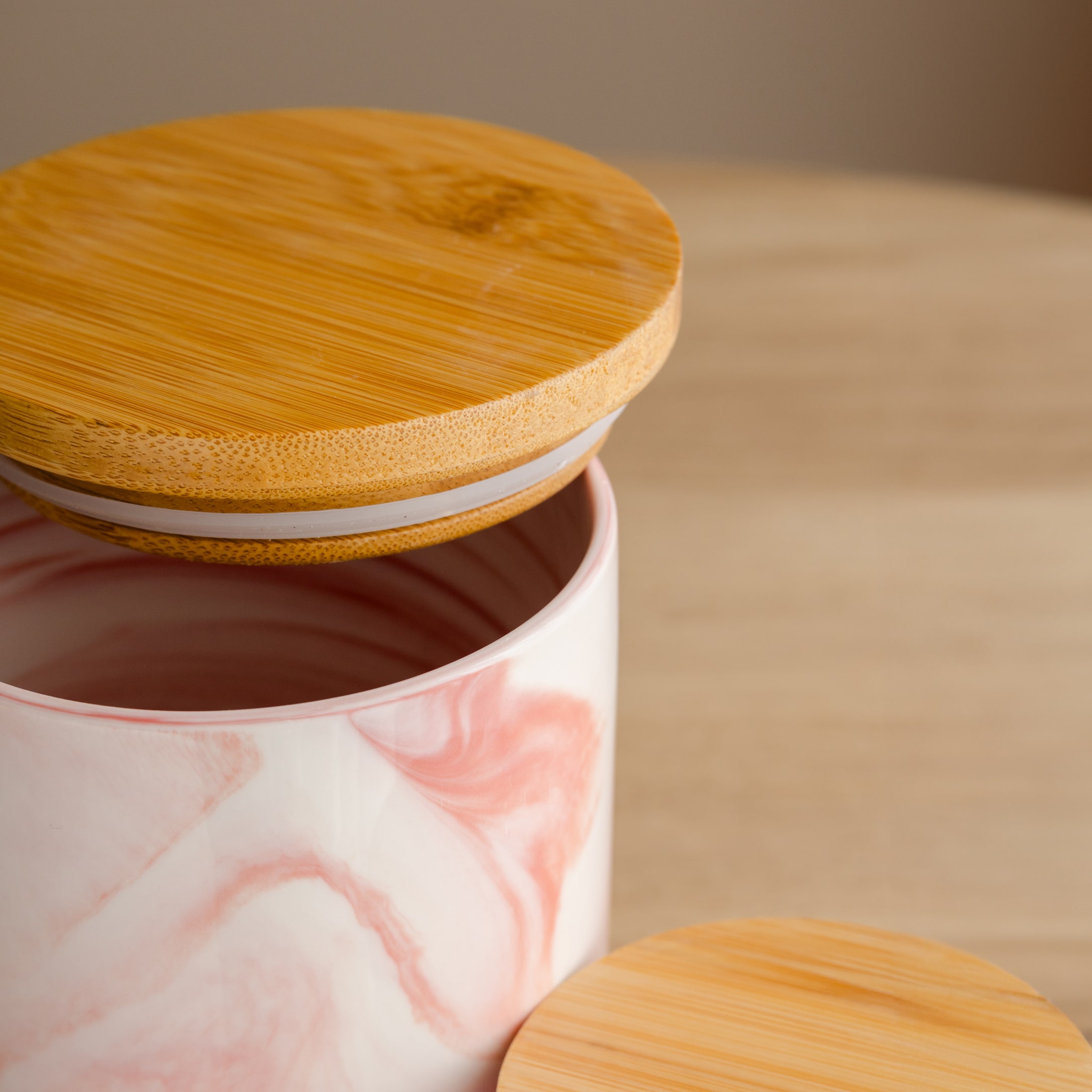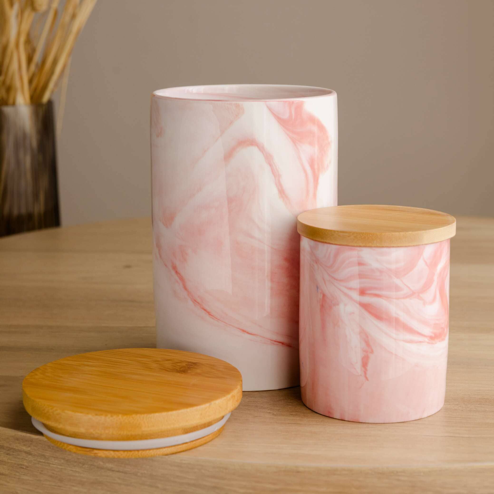 An elegant treat bowl in a sophisticated pink marble color, perfect for keeping your pet's food and snacks fresh. The larger 1300 ml version can store up to 800 g of dry food, while the smaller 360 ml version is ideal for approximately 200 g of food. Each bowl comes with a bamboo lid and silicone seals, ensuring a tight seal and long-lasting freshness of the contents. A practical and aesthetic addition to any home!